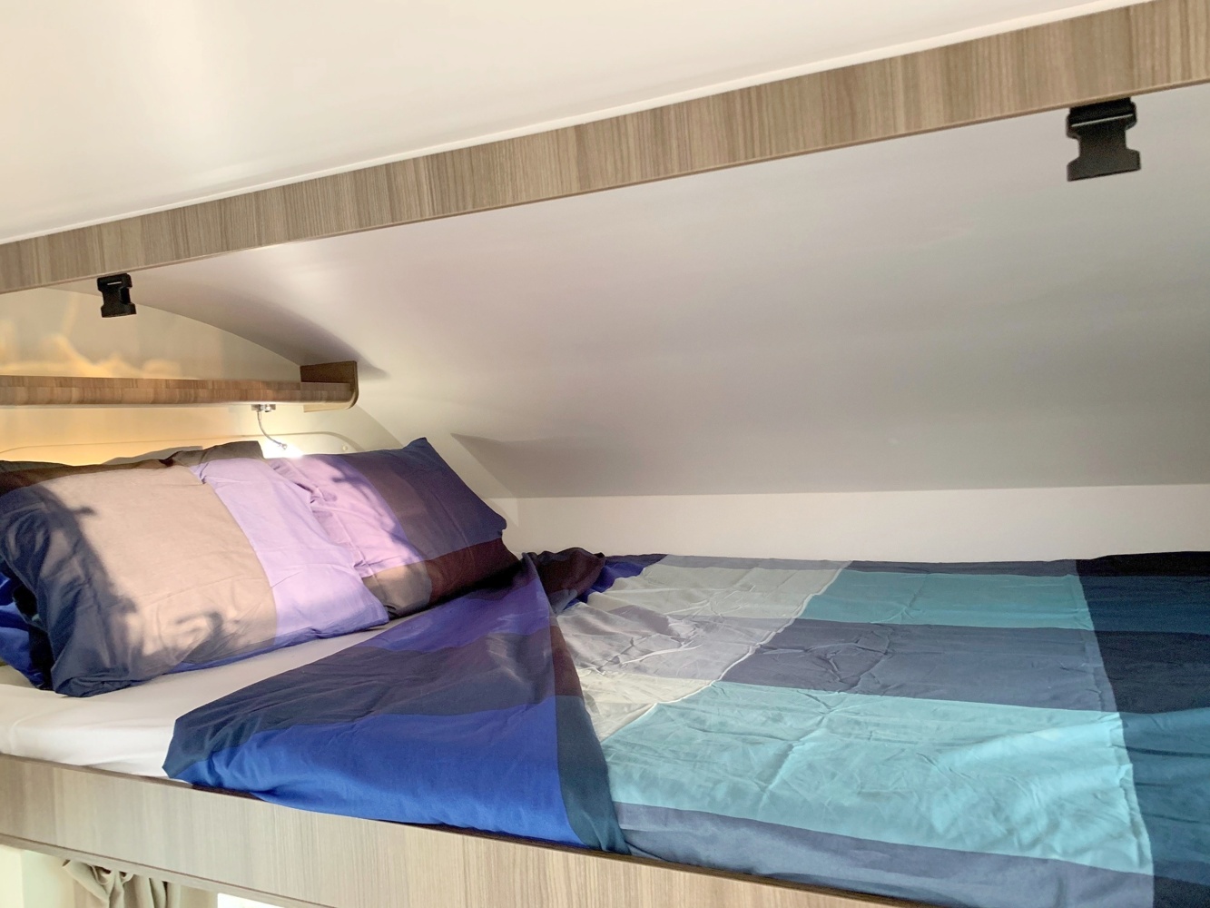 Located in the front area above the driving cab and accessible with a ladder. Very comfortable, this bed also allows for a bigger living space.