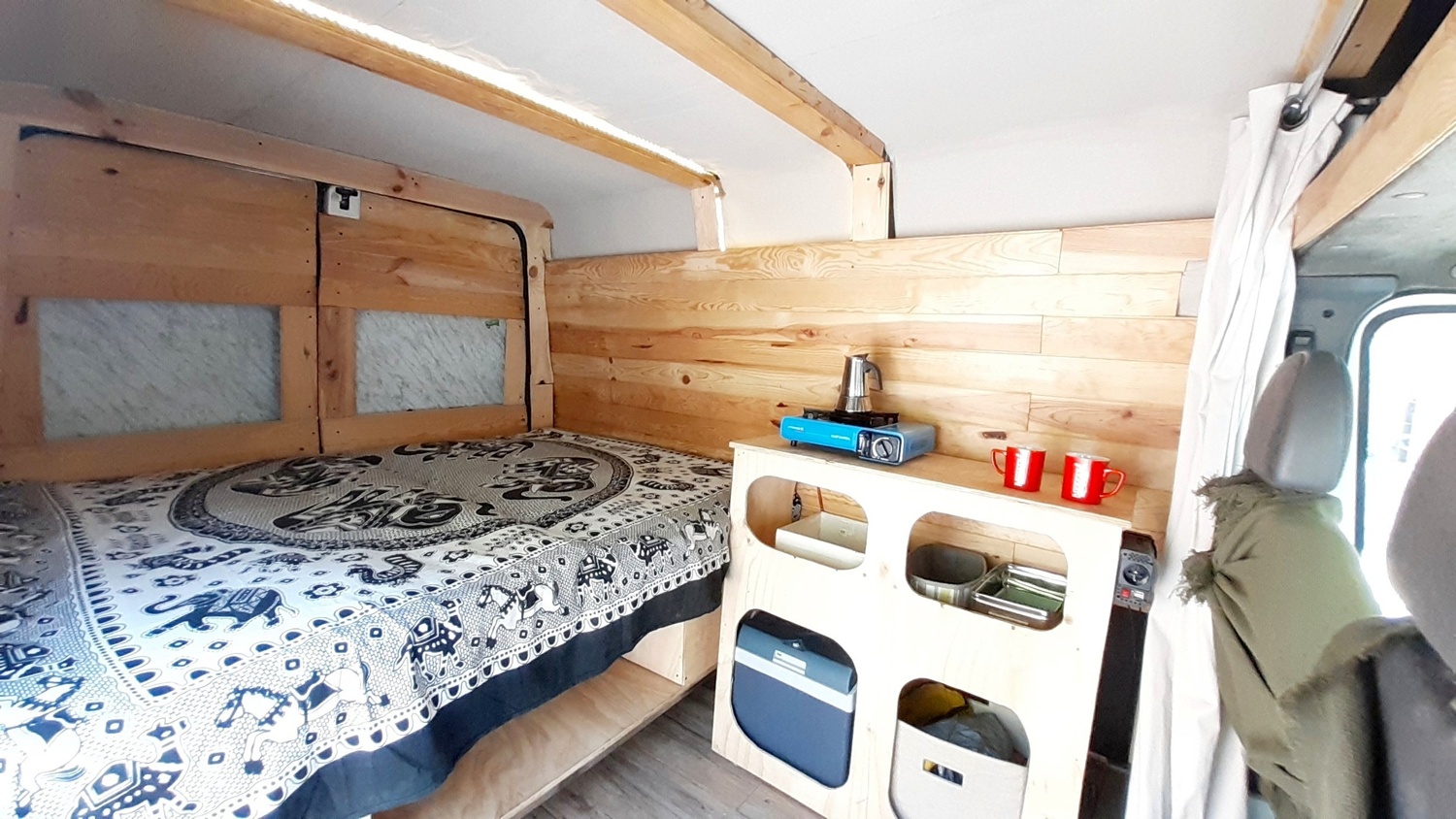 La furgoneta está camperizada por él y es impresionante y acogedora. Lo mejor de todo es que la experiencia fue muy auténtica ya que no parece típica furgoneta de alquiler con el logo de la empresa lo que añade mucho flow al asunto :).
