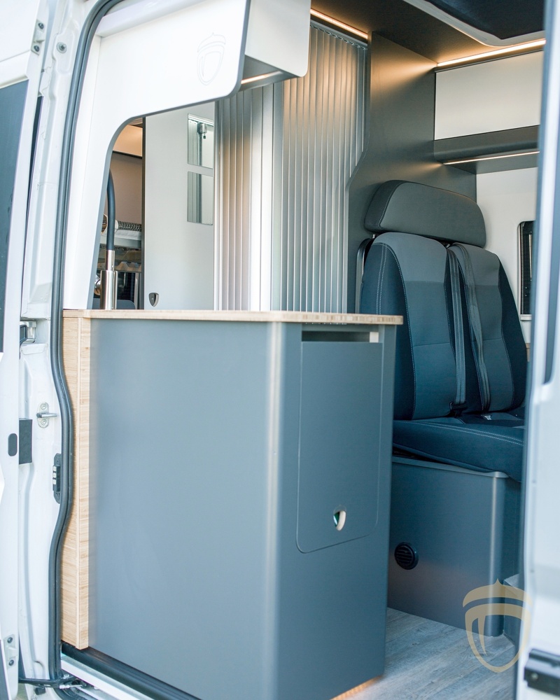 It has a bathroom cabin with chemical toilet, hot shower and hairdryer. In the space created for cooking, it has a large sink with single-lever hot / cold water tap, refrigerator, a comfortable countertop that you can expand to have extra support space, and a portable gas stove that you can use to cook outside. In the dining room you have a nice bamboo table, which you can extend and rotate the front seats, have ample space for meals, games or enjoy comfortable after-dinner meals. In the bedroom there is 1 bed of 125x185, and a bunk bed of 105x185. The bunk bed can be dismantled for travelers who do not need it. It also has storage space both in bedroom and dining lofts, and in the trunk.