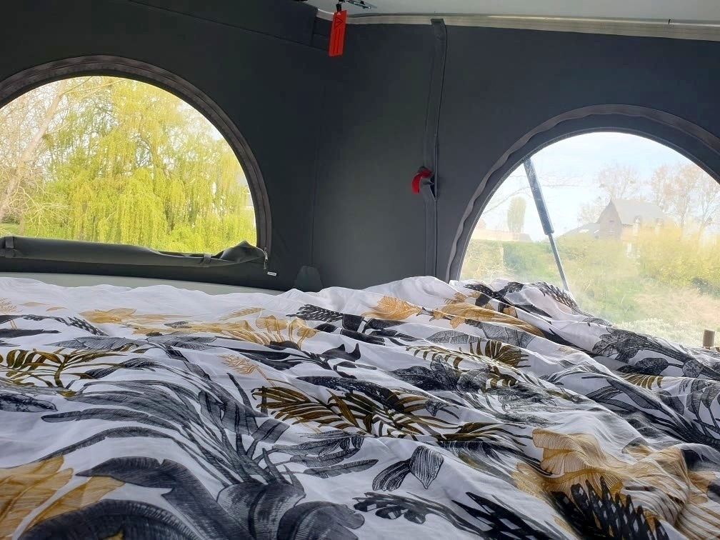 Couchage : le toit relevable dispose d'une vue panoramique, le couchage de 135x200 accueillera facilement 2 adultes, lampe liseuse à disposition ainsi que prise USB .